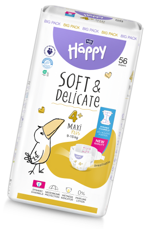 Die Windel bella baby Happy Soft & Delicate Maxi sorgt für Komfort und Sicherheit des Babys. Die neue Kanäle-Technologie gewährleistet eine schnelle Verteilung der Flüssigkeit und ein noch besseres Trockenheitsgefühl für Ihr Kind in jeder Position und zu jeder Tageszeit, während die ideale Anpassung der Windel an den Körper das Risiko unerwünschter Auslaufs reduziert. Die Qualität und Sicherheit der Windeln wurden durch das Dermatest-Zertifikat und die positive Stellungnahme des Instituts für Mutter und Kind bestätigt.