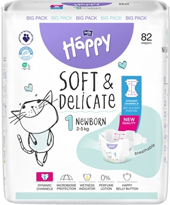 Die bella baby Happy soft & delicate Newborn-Windeln sorgen für Komfort und Sicherheit deines Babys ab den ersten Lebenstagen. Der Nabelausschnitt hilft bei der richtigen Pflege der Neugeborenen und die neue Technologie mit Kanälen sorgt für eine schnelle Flüssigkeitsverteilung und ein noch besseres Trockenheitsgefühl deines Kindes. Die Qualität und Sicherheit der Windeln wurden durch das Dermatest-Zertifikat und die positive Stellungnahme des Instituts für Mutter und Kind bestätigt.