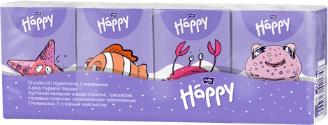 Chusteczki higieniczne mini bella baby Happy to delikatne i trwałe chusteczki stworzone z myślą o dzieciach. Chusteczki trójwarstwowe wykonane są z bardzo miękkiej i przyjemnej w dotyku bibułki, która nie podrażnia noska dziecka. Małe, poręczne opakowanie sprawdzi się w podróży, na spacerze, w domu, a kolorowe nadruki zwierzątek przyciągają uwagę dziecka.